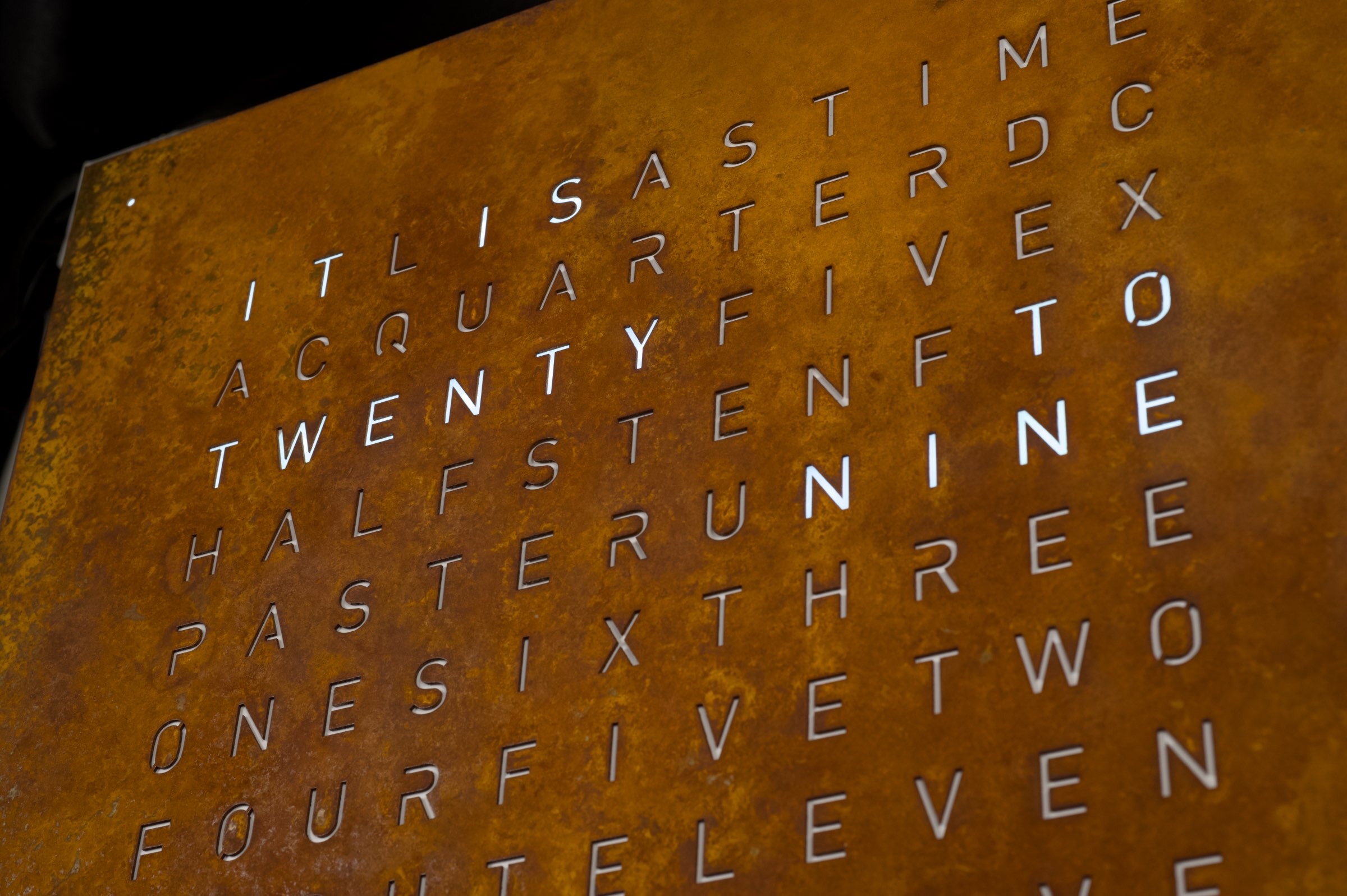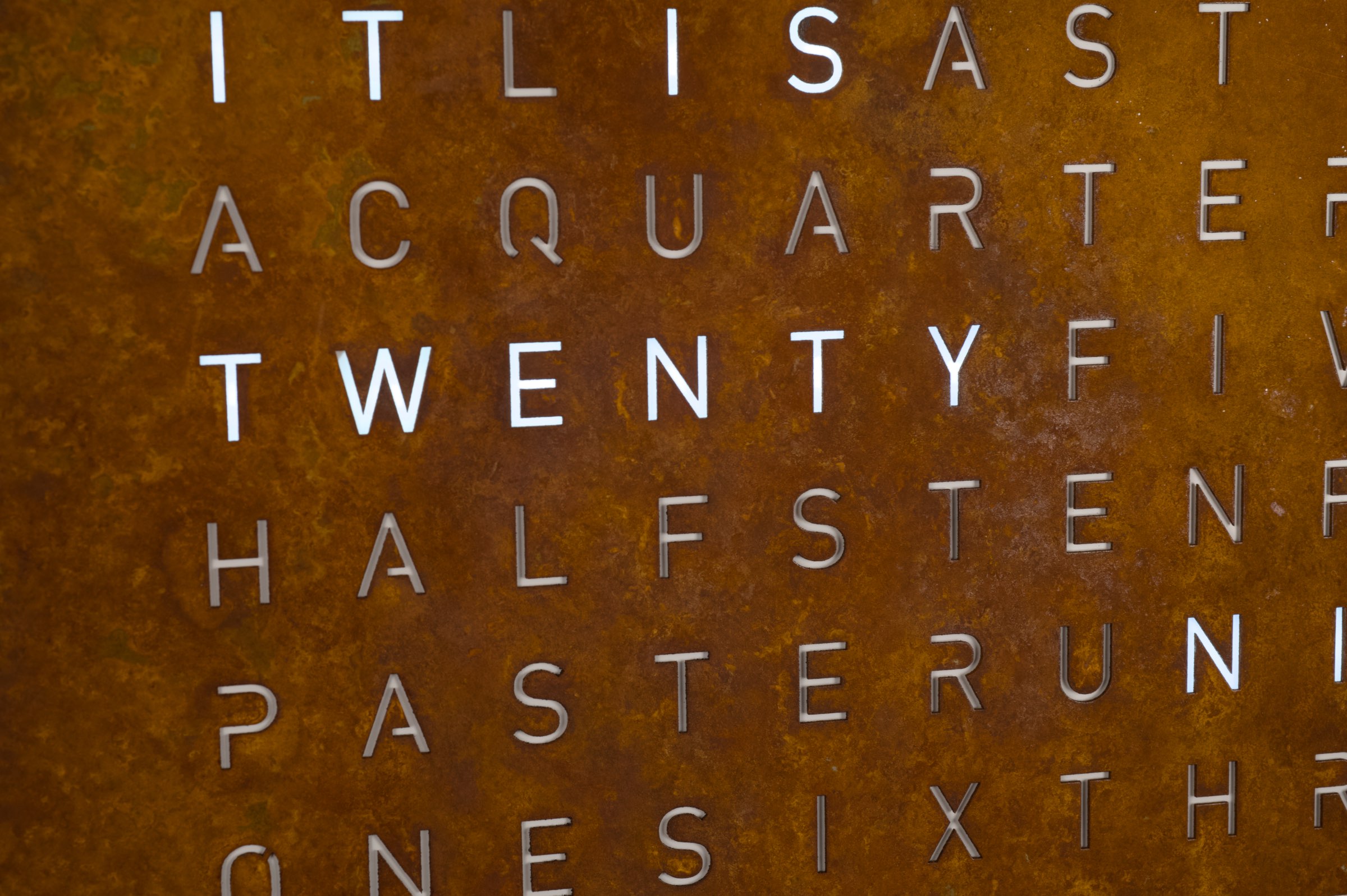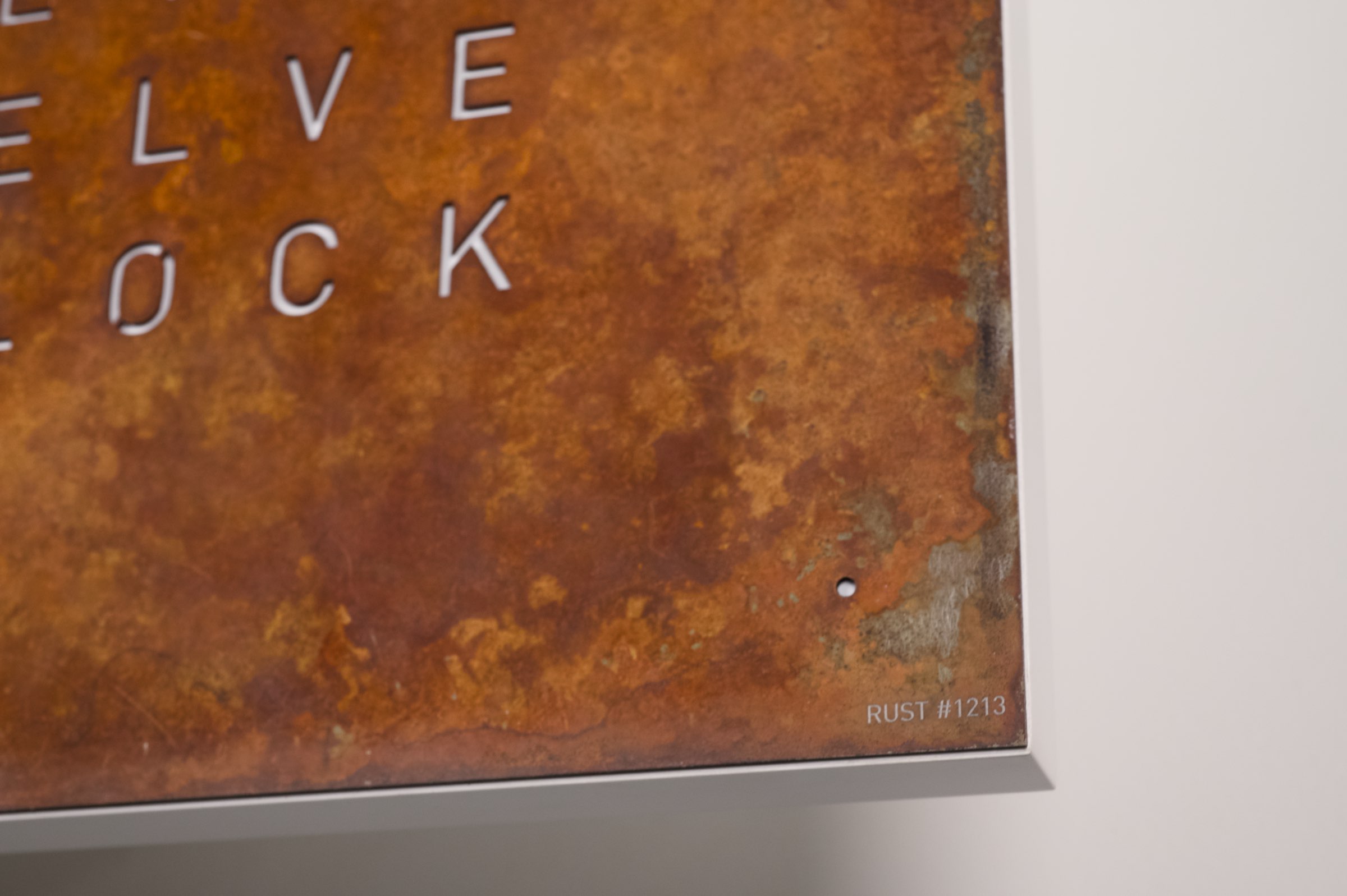 Die Frontfläche dieser Qlocktwo besteht aus einer Stahlplatte, die in einem aufwändigen Verfahren künstlich verrostet wird. Der Oxidierungsvorgang wird dann gestoppt und die Oberfläche fixiert. Jede dieser Frontplatten ist einzeln nummeriert, und jede ist ein Einzelstück, da der Prozess des Verrostens nicht zu hundert Prozent genau kontrolliert werden kann. Die Buchstaben werden mit Hi-Tech-Lasertechnik präzise aus dem Stahl ausgeschnitten. Die Frontplatte wird dann mit Magneten auf der Grundplatte aus lackiertem Holz gehalten. So kann die Front ganz einfach ausgewechselt werden. Sieben ausgesuchte Farben stehen zur Wahl und erzeugen im Wechselspiel mit ihrer Umgebung Kontraste oder Übereinstimmungen. Mehrere andere Materialien sind ebenfalls erhältlich, von poliertem Acrylglas, gebürstetem Edelstahl bis zu Blattgold – browsen Sie einfach durch unsere Produkte.
